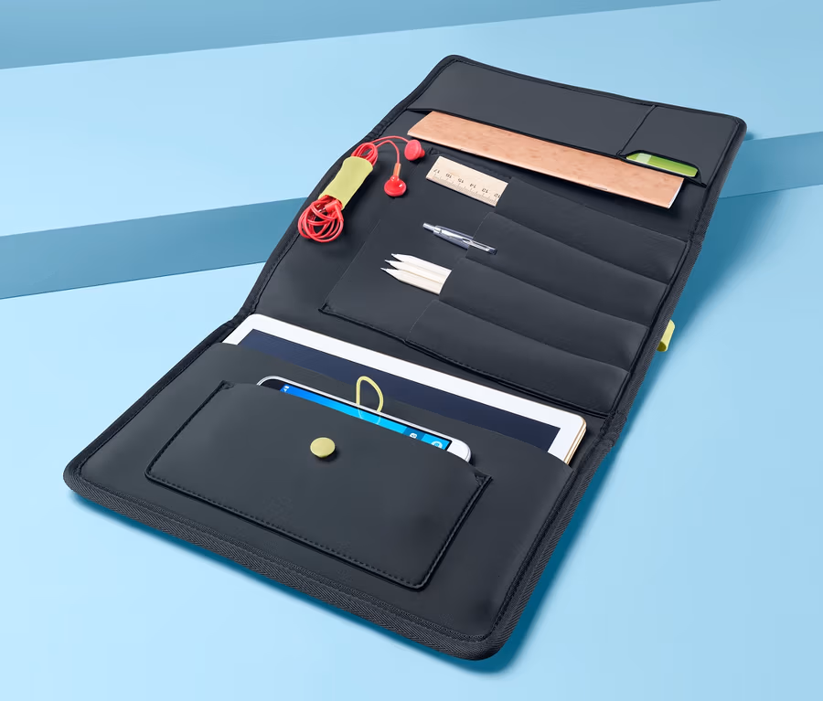 - Platz für Smartphone, Tablet, Kopfhörer, Karten und weitere Büroutensilien