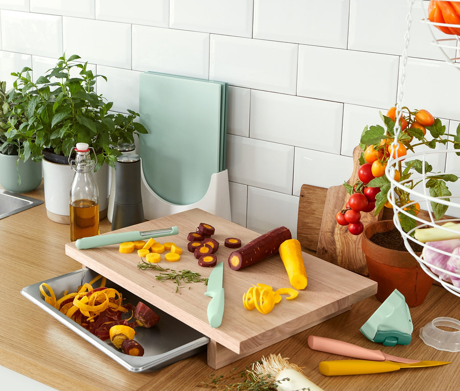- Auf dem Brett geschnittene Zutaten oder Schnittabfälle können in Schale aufgefangen werden