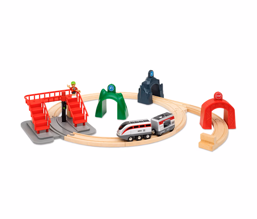 Mit diesem Set wird der Grundstein für die digitale Erweiterung der „BRIO® World“ gelegt. Die drei Tunnel sind hier der Clou, da sie völlig neue Spielmöglichkeiten eröffnen: In ihnen sind Microchips enthalten, die dem Zug Kommandos geben. Ein Tunnel bringt den Smart-Zug zum Stehen, der nächste löst Sound- und Leuchteffekte aus und der dritte Tunnel lässt den Zug rückwärts fahren. An der Fußgängerbrücke kann das Kind selbst entscheiden, ob der Zug durchfahren oder stehen bleiben soll. Alle Elemente sind nach Belieben auf der Strecke platzierbar. So kommt Action ins Eisenbahnspiel – und mit ihr viele neue Wege zu kreativem Spielspaß.