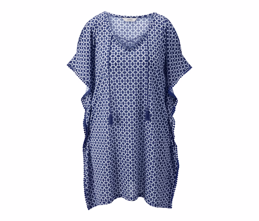Diese Strandtunika in angenehm weicher, leichter Single-Jersey-Qualität bietet locker-luftigen Tragekomfort und ist ein modisches Sommer-Highlight. Sie ist mit einem hohen Anteil an Bio-Baumwolle gefertigt und mit einem sommerlichen Alloverprint gestaltet. Der V-Ausschnitt mit Kordel sowie Quasten, die dekorative Borte an den Seitennähten und die überschnittenen Schultern mit modischen Cut-outs verleihen dem Poncho-Schnitt das gewisse Etwas.