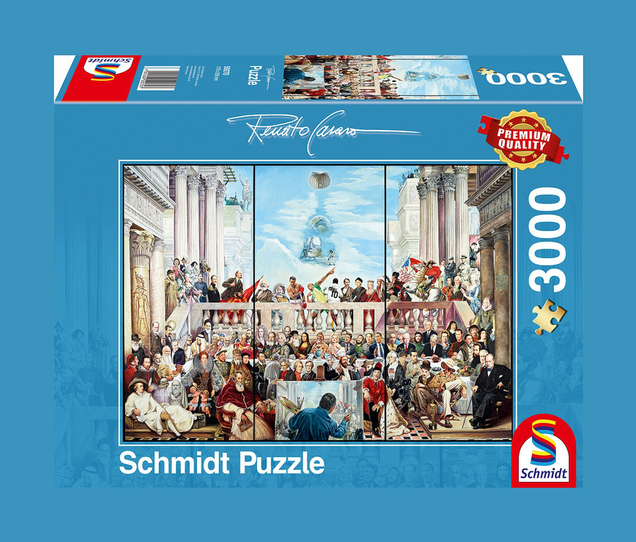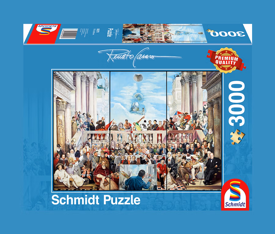 Das fertige Motiv zeigt das bekannte Bild »So vergeht der Ruhm der Welt« von Renato Casaro, auf dem sich eine bunte Mischung aus Persönlichkeiten der Weltgeschichte versammelt hat – da gibt es wie bei einem klassischen Suchbild auch nach dem Puzzeln noch jede Menge zu entdecken.