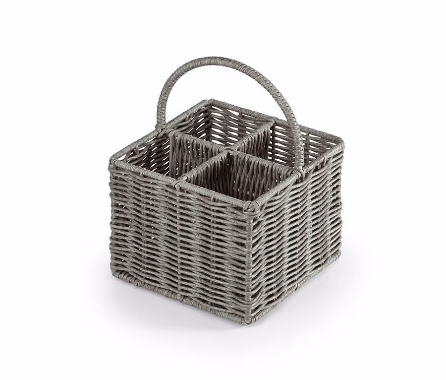 Damit lässt sich die Mahlzeit im Handumdrehen vom Küchentisch ins Freie verlegen: Dieser Besteckkorb eignet sich für die unterschiedlichsten Küchenutensilien wie zum Beispiel Besteck, Gewürze sowie Saucen und erleichtert dank seines Tragehenkels den Transport. Der Korb eignet sich sowohl für die Indoor- als auch für die Outdoor-Nutzung, bietet in vier Fächern Platz und hat ein stabiles Metallgestell mit Kunststoffummantelung. Sie verleiht eine zeitlose Korbgeflechtoptik und ist feucht abwischbar.