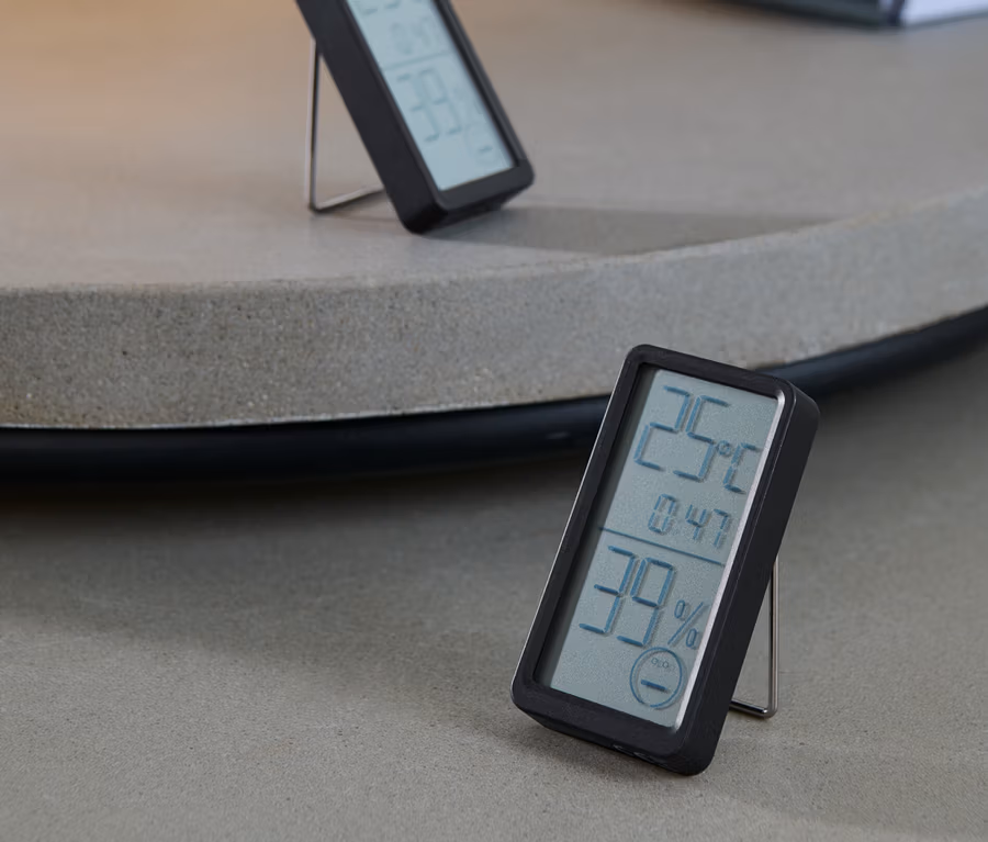- Zeigt Temperatur, Luftfeuchtigkeit und Uhrzeit