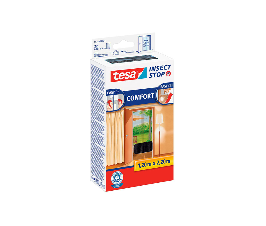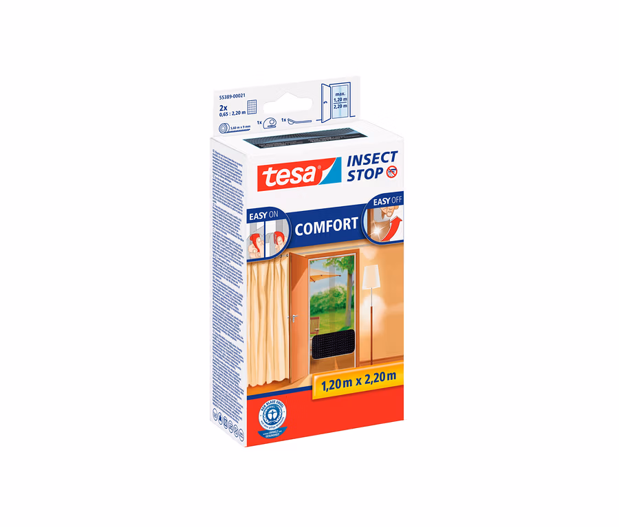 Das hochwertige und feinmaschige tesa® Insect Stop Fliegengitter »COMFORT« für Türen ist der ideale Schutz vor lästigen Insekten aller Art. Es lässt sich dank des Easy-on/Easy-off-Systems einfach anbringen und rückstandslos wieder entfernen. Neben dem selbstklebenden Klettband, das sich unter anderem durch die überlegene tesa®-Klebetechnologie auszeichnet, befinden sich im Lieferumfang noch eine praktische Andrückhilfe und ein Schneidewerkzeug. Man benötigt also kein weiteres Werkzeug, um das Fliegengitter am Türrahmen zu befestigen. Nachdem die Flächen gereinigt sind, auf die das Klettband geklebt werden soll, muss nur noch das Fiberglasgewebe fest angedrückt und das überstehende Gewebe abgeschnitten werden. Ist die Arbeit getan, haben Fliegen, Mücken, Wespen, Spinnen und andere Insekten – anders als Frischluft – keine Chance mehr in die Wohnung zu gelangen. Besonders für diejenigen, die übermäßig oder sogar allergisch auf Insektenstiche reagieren, ist das eine gute Nachricht. Durch die UV-Beständigkeit bietet das Fliegengitter, das Sommer für Sommer wiederverwendet werden kann, einen leichten Sonnenschutz. Außerdem ist das Fliegenschutzgitter feucht abwischbar.