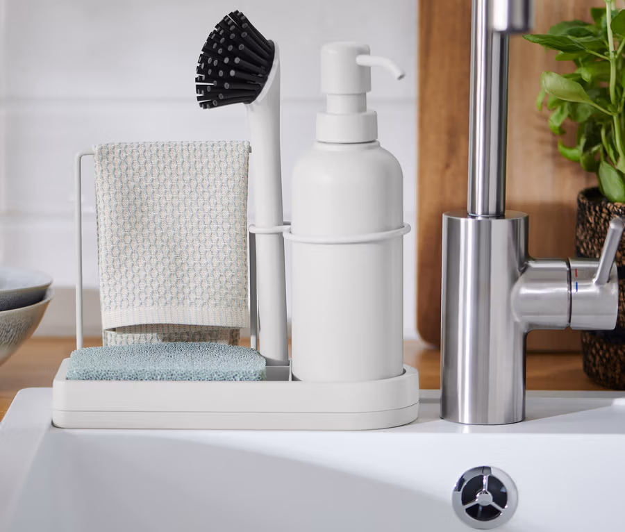 - Stilvolles Geschirrspül-Set für Spülbürste, Seifenspender und Reinigungstuch