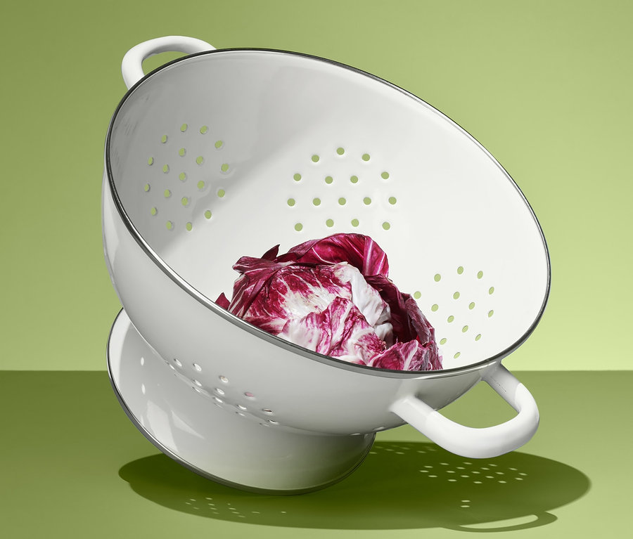 Das Sieb hat zwei seitliche Griffe und wie so ziemlich alles aus Emaille kann man es auch zweckentfremden – und als schicke Deko-Schale im Retro-Look verwenden.