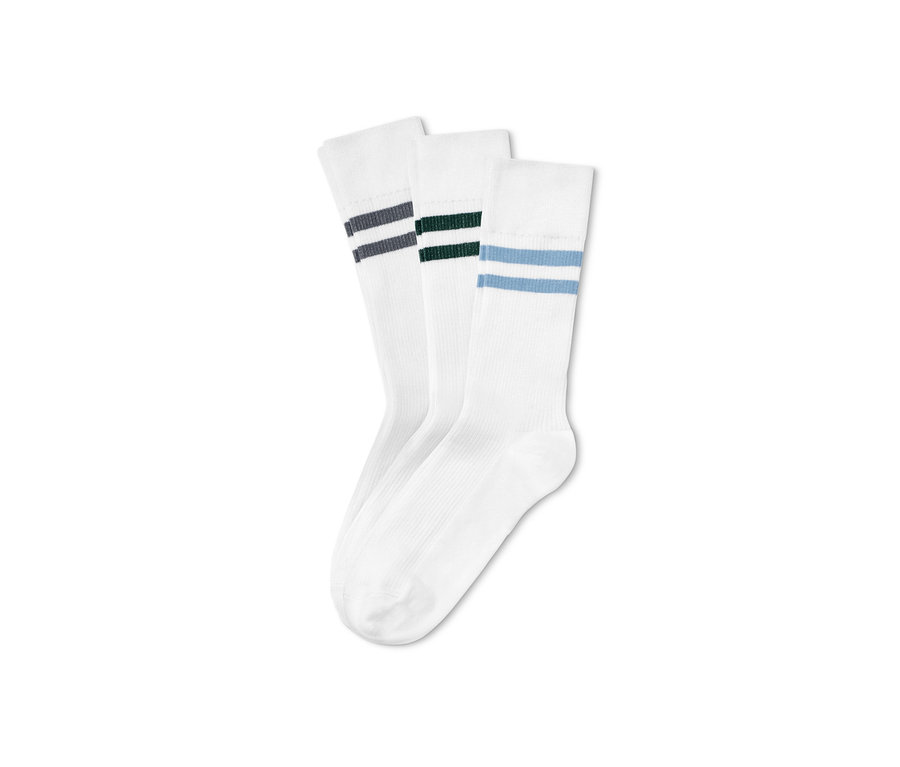 Diese drei Paar Herrensocken sind ideal für sommerlich leichte und sportliche Freizeitoutfits. Mit ihrer Baumwoll-Mischqualität liegen sie angenehm weich auf der Haut, Elasthan sorgt im Stoff für Formbeständigkeit, einen perfekten Sitz und hohen Tragekomfort. Die Socken haben bequeme, elastische Rippbündchen, die weder rutschen noch einschnüren. Die darunterliegenden Kontraststreifen setzen modische Akzente.