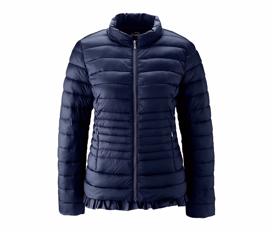Wiener Nähte sorgen für eine feminine Silhouette und die zwei Eingrifftaschen der Jacke sind nahtverdeckt. Ein Eyecatcher der Steppjacke mit leicht glänzender Oberfläche ist der angesetzte Volant am Saum, der den coolen Look perfekt abrundet.