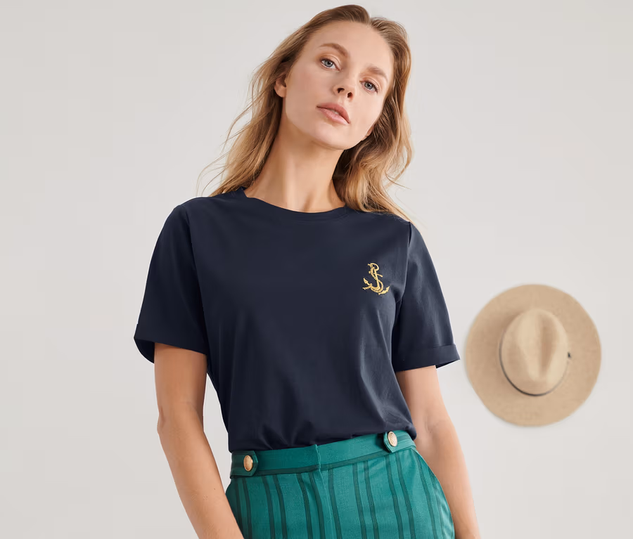 - Goldfarbene Ankerstickerei auf der Brust