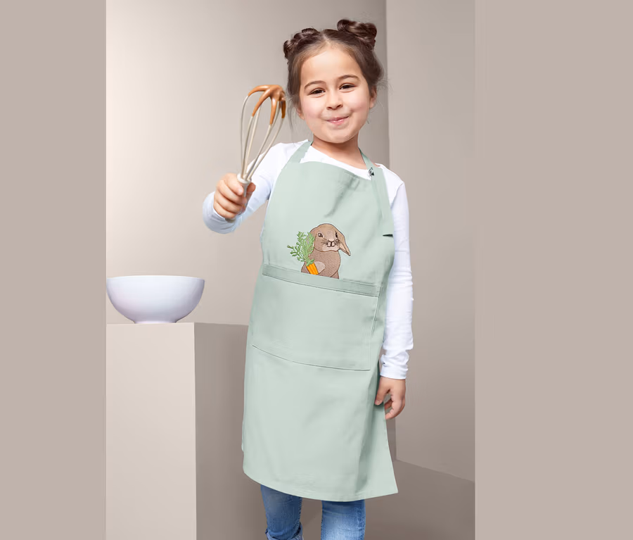 Die Kinder-Küchenschürze besteht aus reiner Baumwolle und ist etwa 57,5 Zentimeter lang. Das Nackenband kann individuell angepasst werden und mit dem Bindeband wird die Schürze an der Taille fixiert. Sie ist mit einer aufgesetzten Tasche für kleine Küchenutensilien ausgestattet und mit einer niedlichen Hasenstickerei versehen.