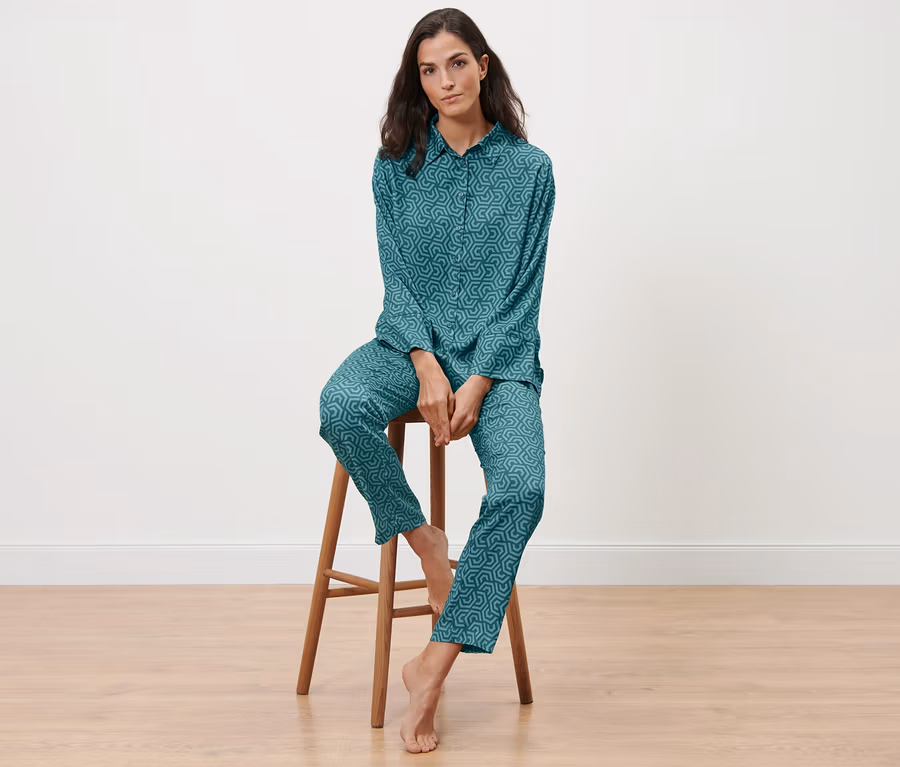 - Dieser Pyjama beinhaltet Fasern aus nachhaltigem Holz.