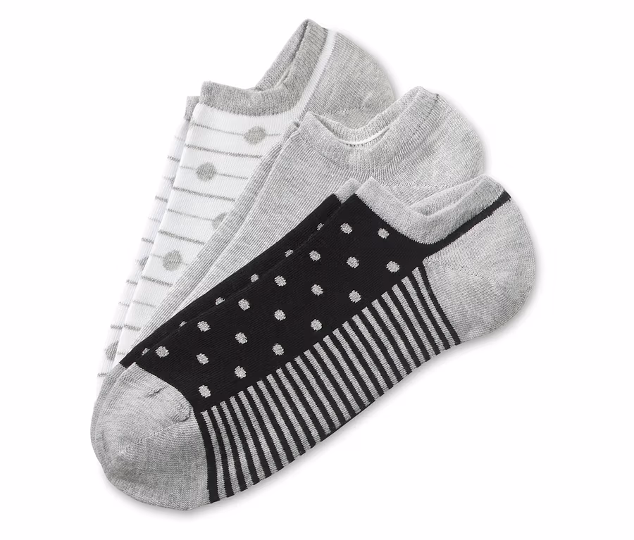 Die Söckchen sind mit extraflacher Zehennaht gearbeitet und haben verstärkte Spitzen und Fersen. Das schmale Komfortbündchen verhindert ein Einschnüren und in Sneakern sind sie praktisch unsichtbar – fast ein bisschen schade, zwei Paar sind nämlich mit effektvoll silberglänzendem Garn durchzogen.