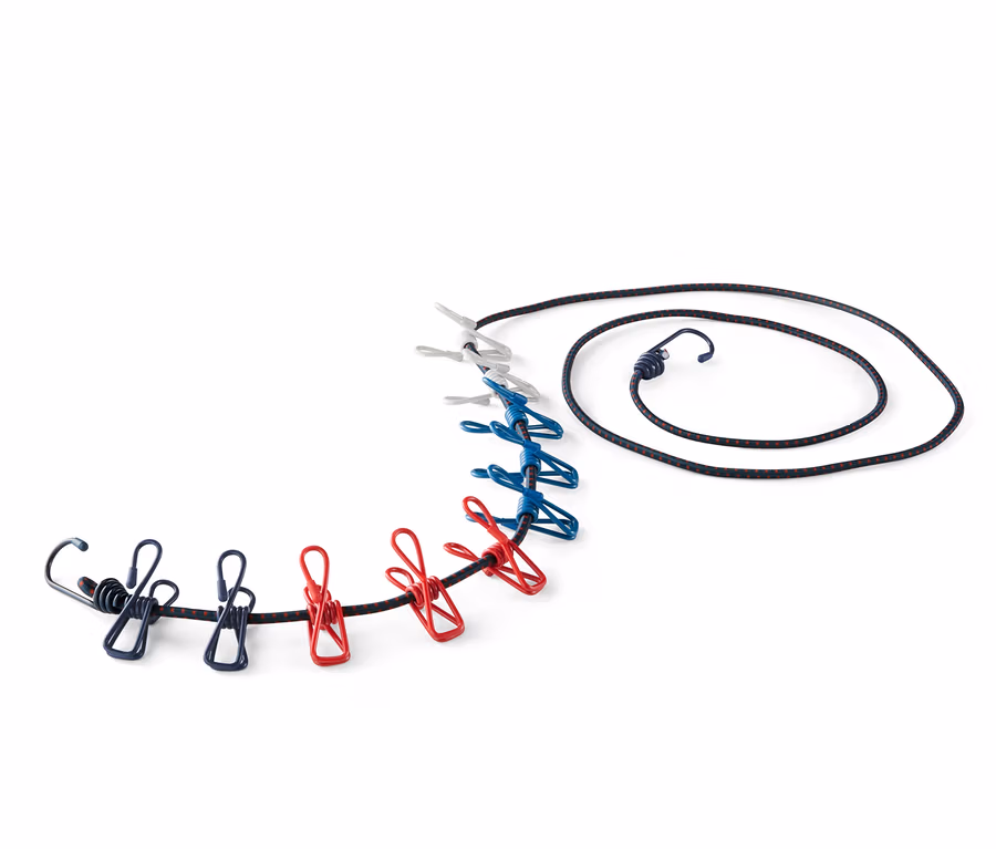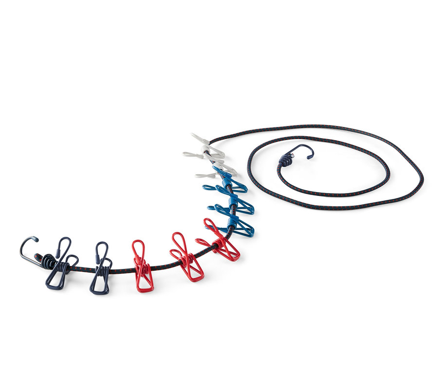 Die Leine ist witterungs-, frost- sowie UV-beständig und kann mit ihren Haken einfach zwischen Bäumen, Zeltstangen und Co. aufgespannt werden – sie lässt sich ganz nach Bedarf von etwa 190 auf bis zu 240 Zentimeter dehnen. Für die Wäsche sind zehn beschichtete, flexible Klammern mit dabei.