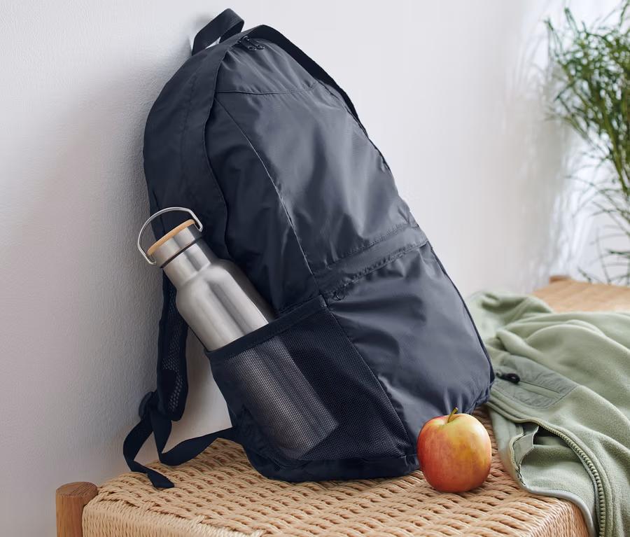 • Klein zusammenfaltbar und in integrierter Reißverschlusstasche verstaubar