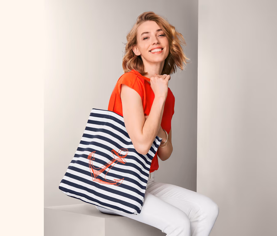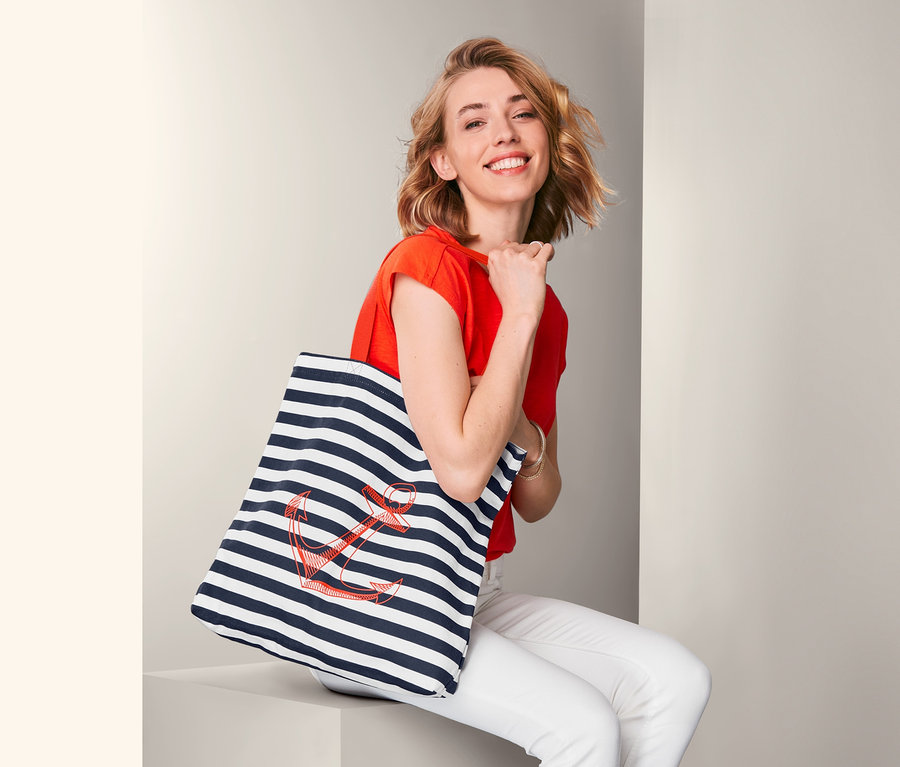 Ob ans Meer, zum Shoppen oder an den Badestrand – mit dieser sommerlichen, maritimen Tasche aus reiner Bio-Baumwolle kann der nächste Ausflug kommen. Der Streifenlook mit einem platzierten, kontrastfarbigen Ankerprint auf der Vorderseite erinnert sofort ans Meer. Das große Hauptfach ist mit einem Druckknopf verschließbar und eine zusätzliche Innentasche bietet Platz für kleinere Dinge.