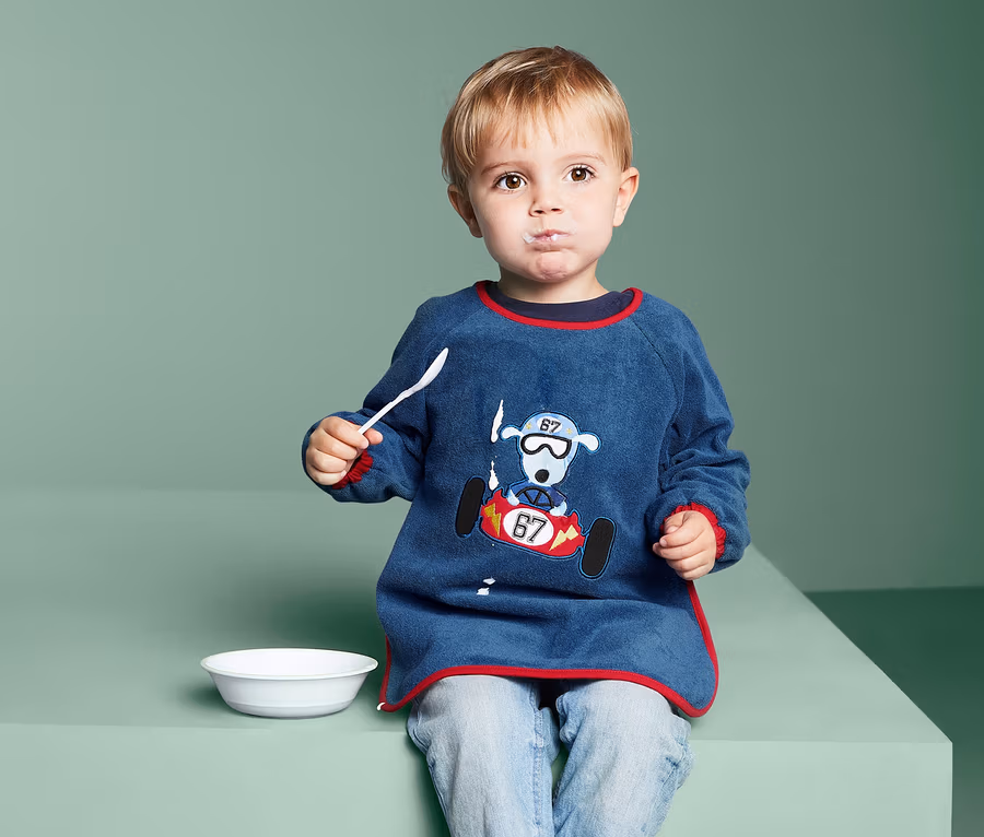 Die kleinen Helfer sind außen aus saugfähigem Frottier mit niedlichen Applikationen gefertigt und innen mit feuchtigkeitsabweisender Folie beschichtet – ein optimaler Schutz der Kleidung, der im Gegensatz zu anderen Lätzchen auch die Ärmel abdeckt. Sie lassen sich dank elastischen Bündchen und Klettverschluss besonders leicht an- und ausziehen und geben den Kindern nie das typische „Lätzchen-Gefühl“. Schließlich sind die Kleinen ja schon groß!