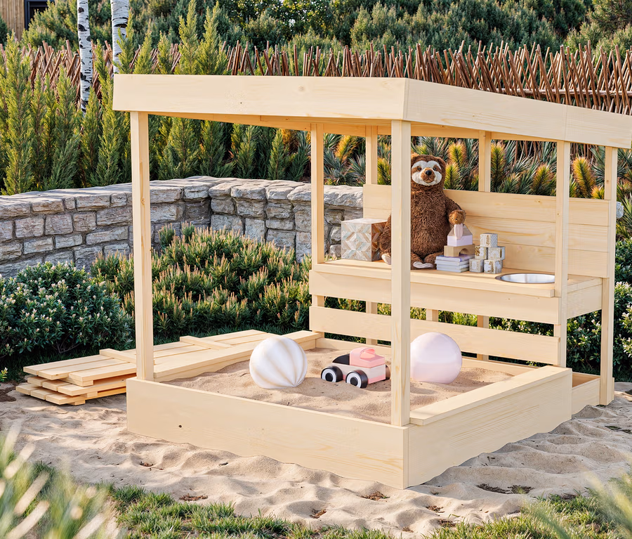 Inkl. Edelstahlschüssel für die Matschküche, 3-teiliger Abdeckung, Überdachung, Montagematerial und -anleitung