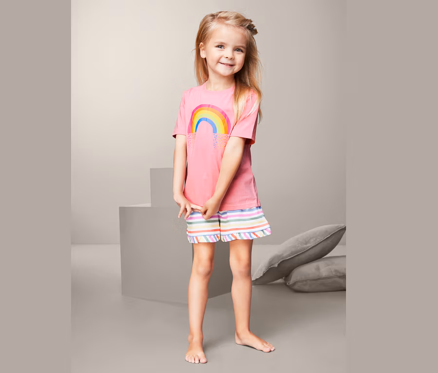 Auf dem Shirt ist ein wunderschöner Regenbogen, der nach unten mit bunten Herzchen ausläuft. Auch die Short sind durch ihre Rüschenkante mit einem süßen Detail verziert.