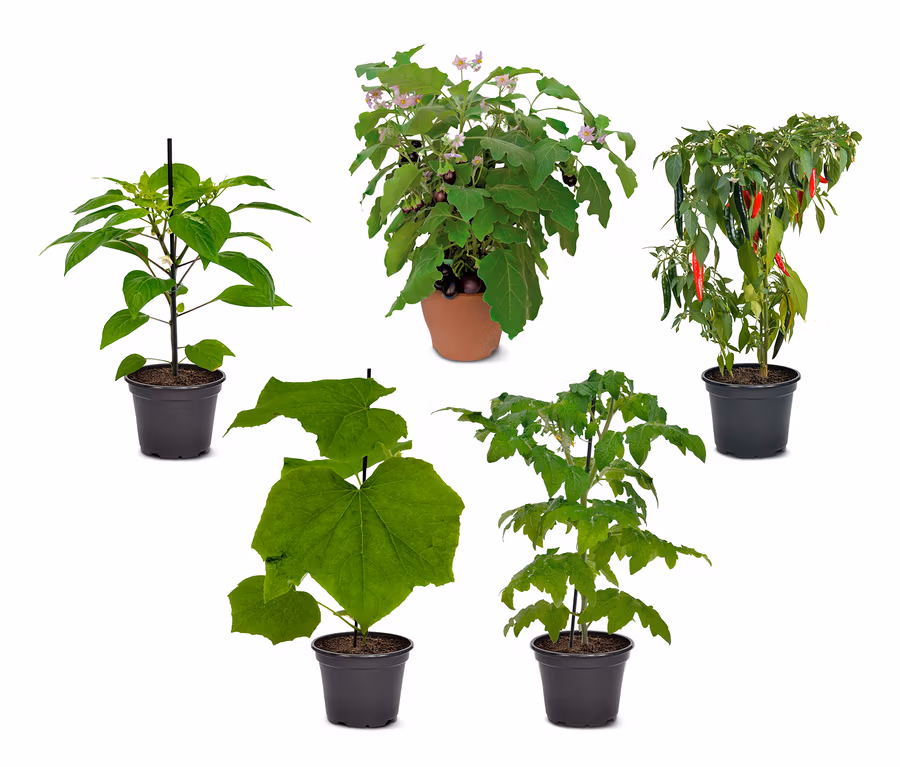 - Höhe bei Lieferung Tomate ca. 30 cm, Peperoni ca. 25 cm, Paprika ca. 25 cm, Gurke 30 cm, Aubergine ca. 25 cm
