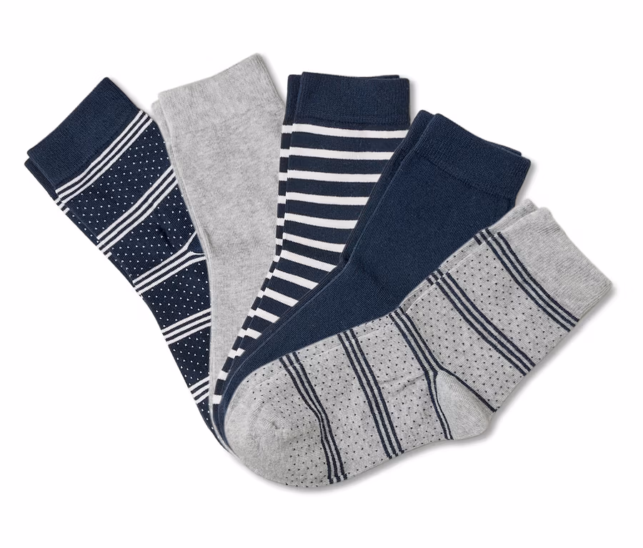 - 1x dunkelblau mit weißen Streifen und kleinem Einstrick, 1x grau meliert, 1x dunkelblau-weiß gestreift, 1x dunkelblau, 1x grau meliert mit dunkelblauen Streifen und kleinem Einstrick