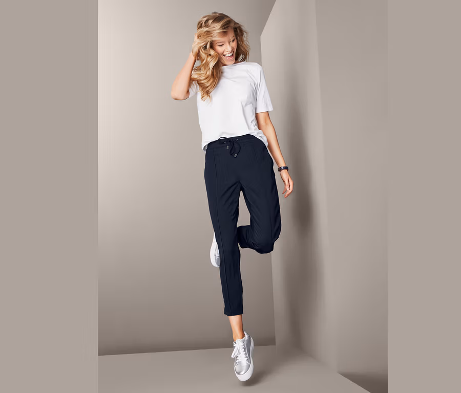 Die Hose aus recyceltem Material sitzt dank des breiten, elastischen Komfortbundes mit Tunnelzug und Bindeband immer perfekt. Ein schönes Detail bildet das schmal abgenähte Fältchen an der Vorderseite, welches das Bein optisch leicht streckt. Die zwei seitlichen Eingrifftaschen und eine Zier-Gesäßtasche runden das sommerliche Design der Hose ab.