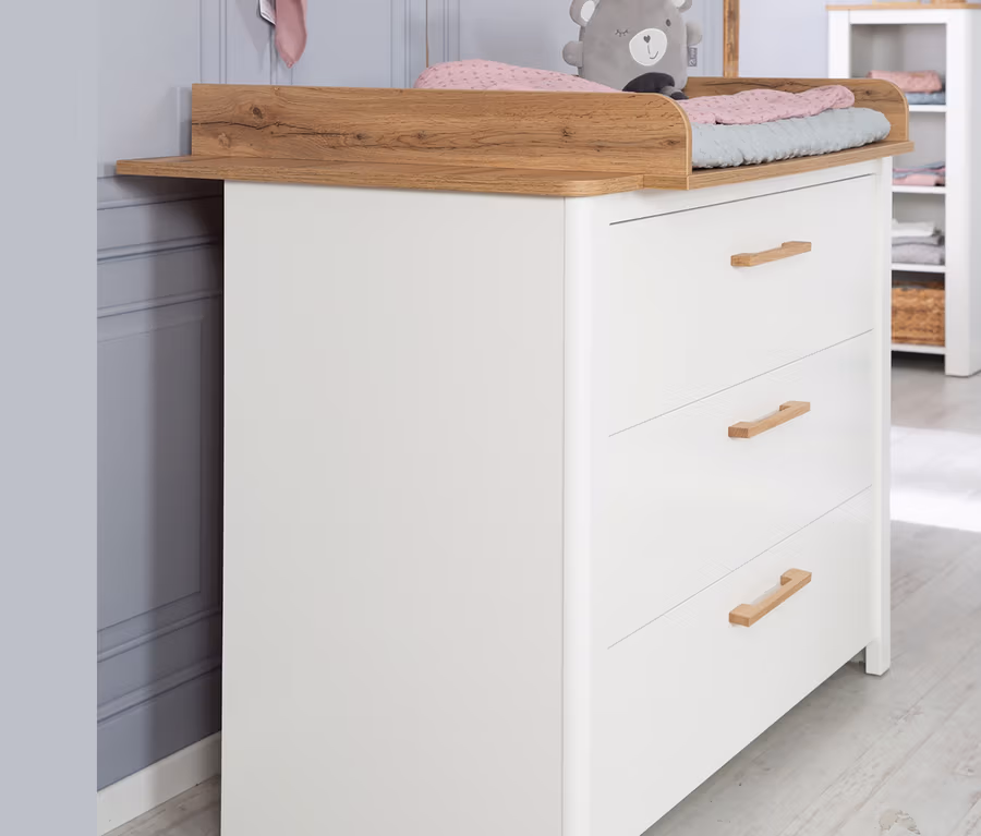 - Extratiefe Wickelkommode mit formschönen Eichen-Massivholz-Griffen und abgerundetem Korpus