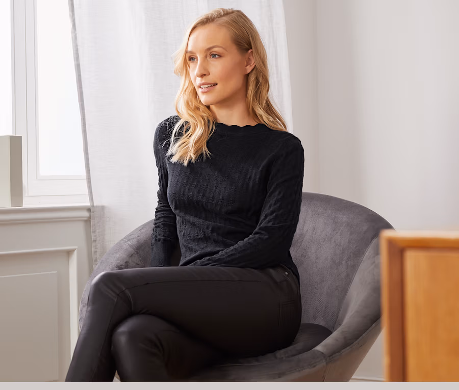 - Rundhalsausschnitt, Ärmelabschluss und Saum mit Wellenkante