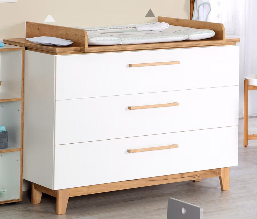- Obere Schublade mit hochwertigen Massivholzgriffen, komplett herausziebar – Stauraum für Wickelutensilien und Windeln
