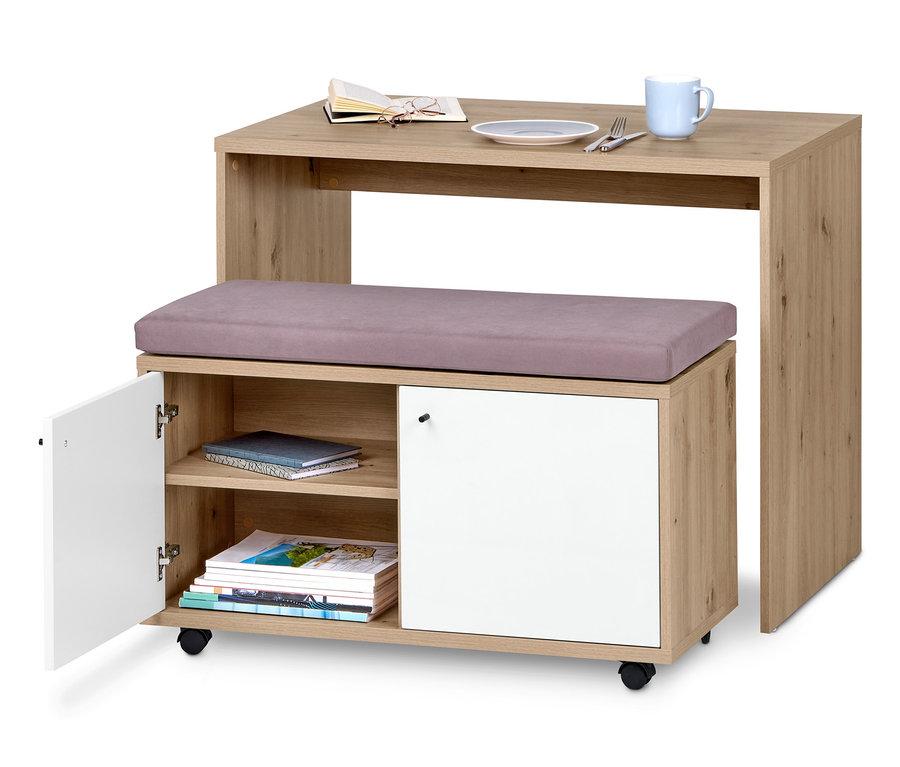 - Bank mit 4 bodenschonenden Rollen platzsparend unter dem Tisch verstaubar