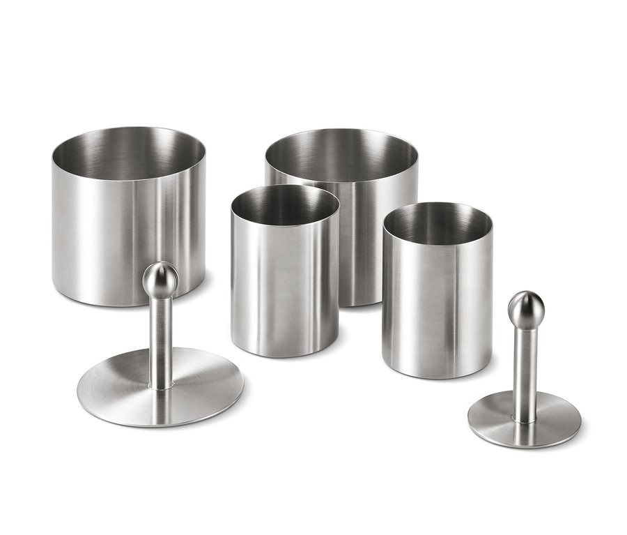Mit diesem Set lassen sich auf einfachste Weise optische Highlights auf dem Teller schaffen. Die Vorspeisen- und Dessertringe können auf dem Teller platziert und befüllt werden: ideal für weichere Beilagen wie Tatar oder Pürees. Die Stempel helfen beim Auslösen und alles bleibt perfekt in Form. Geschichtete Desserts, Vorspeisen und Beilagen wie im Top-Restaurant kann man so auch zu Hause zaubern. Und damit es gleich losgehen kann, sind auch schon zwei Rezeptideen dabei.