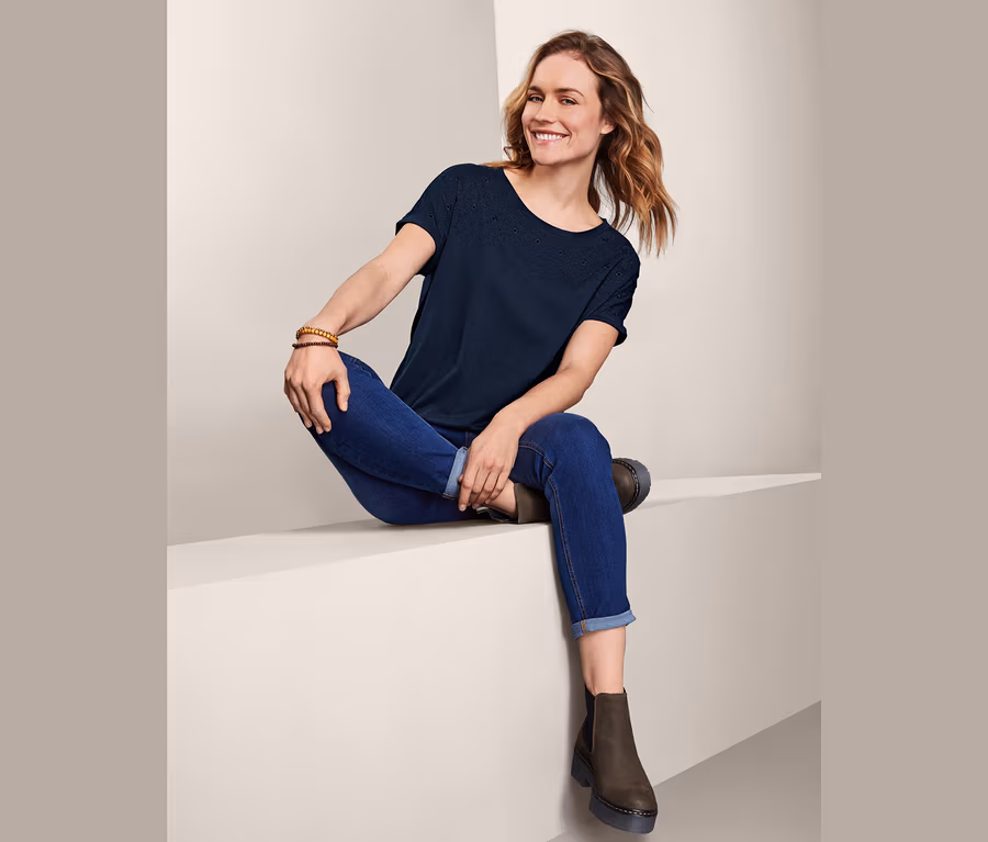 Dieses Kurzarmshirt ist mit einer zarten Stickerei versehen und hat noch weitere stylische Details vorzuweisen. Seine überschnittenen Schultern und der Rundhalsausschnitt sorgen für eine luftig-lässige Passform und ergänzen perfekt den sommerlichen Look. Auch der fixierte Ärmelumschlag ist ein kleiner Hingucker. Doch nicht nur optisch überzeugt das Shirt, es fühlt sich auch toll an: Seine Baumwoll-Modal-Mischqualität ist herrlich weich und liegt angenehm auf der Haut. Für eine optimale Passform ist der Saum elastisch und engt nicht ein. Außerdem wurde das T-Shirt mir Bio-Baumwolle gefertigt.