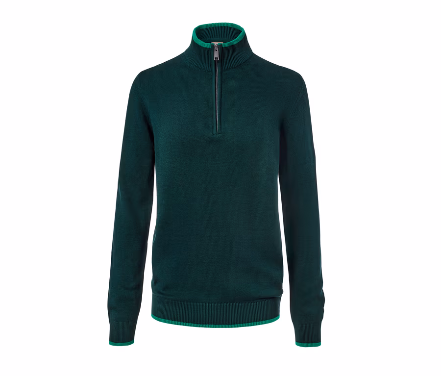 - Rippbündchen mit kontrastfarbenem Streifen an Kragen, Ärmeln und Saum