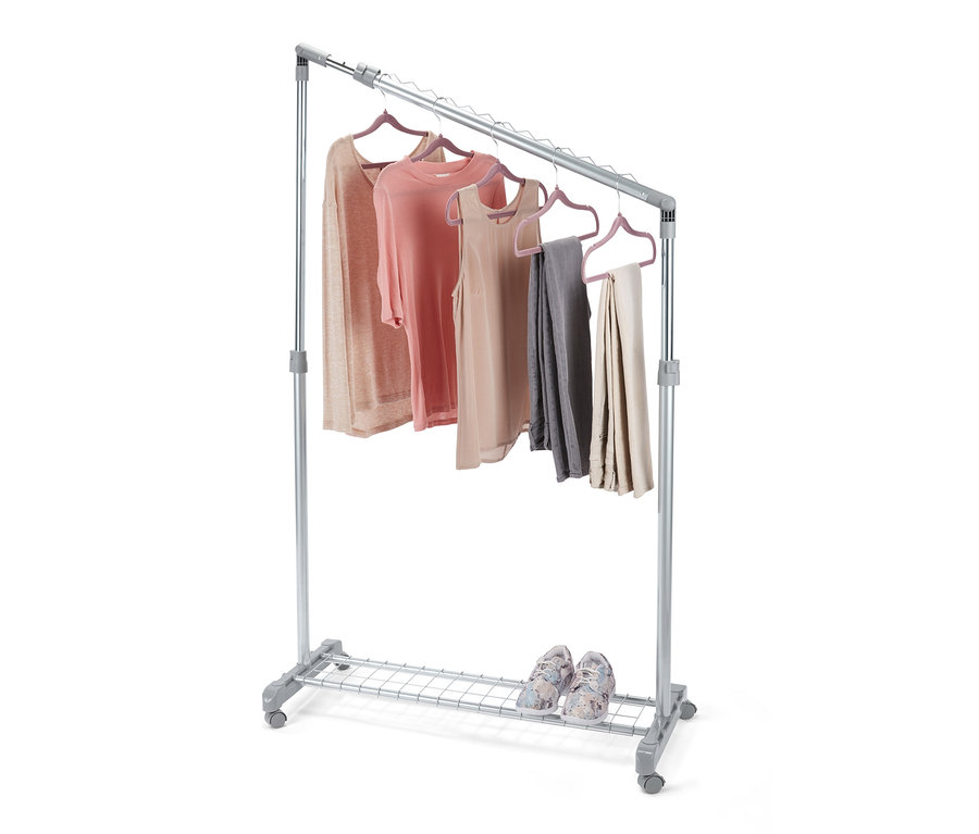 - In schräger Ausrichtung ermöglichen Auskerbungen in der ausgezogenen Stange das Aufhängen weiterer Kleiderbügel