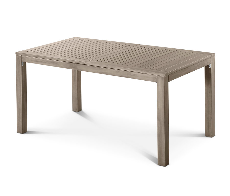 Der wetterfeste und widerstandsfähige Gartentisch ist aus hochwertigem, lackiertem, FSC®-zertifiziertem Akazienholz gefertigt und mit Beschlägen aus verzinktem Metall versehen. Er versteckt unter seiner Tischplatte zwei ausklappbare Teile. Dank ihnen lässt sich das Gartenmöbel von 160 auf 200 Zentimeter verlängern. Auseinandergeklappt hat die Tischplatte eine Schirmaussparung – so kann man mit einem Schirm direkt über dem Tisch für Schatten sorgen.
