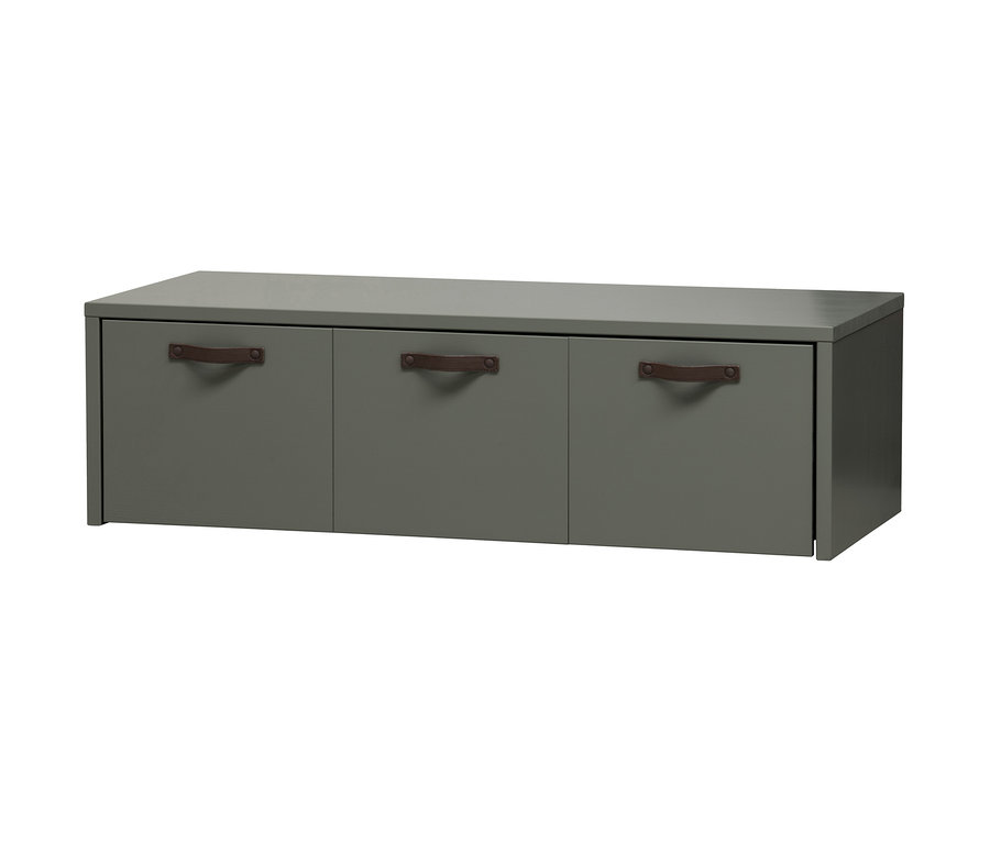 - 3 große Ablagefächer mit braunen Ledergriffen