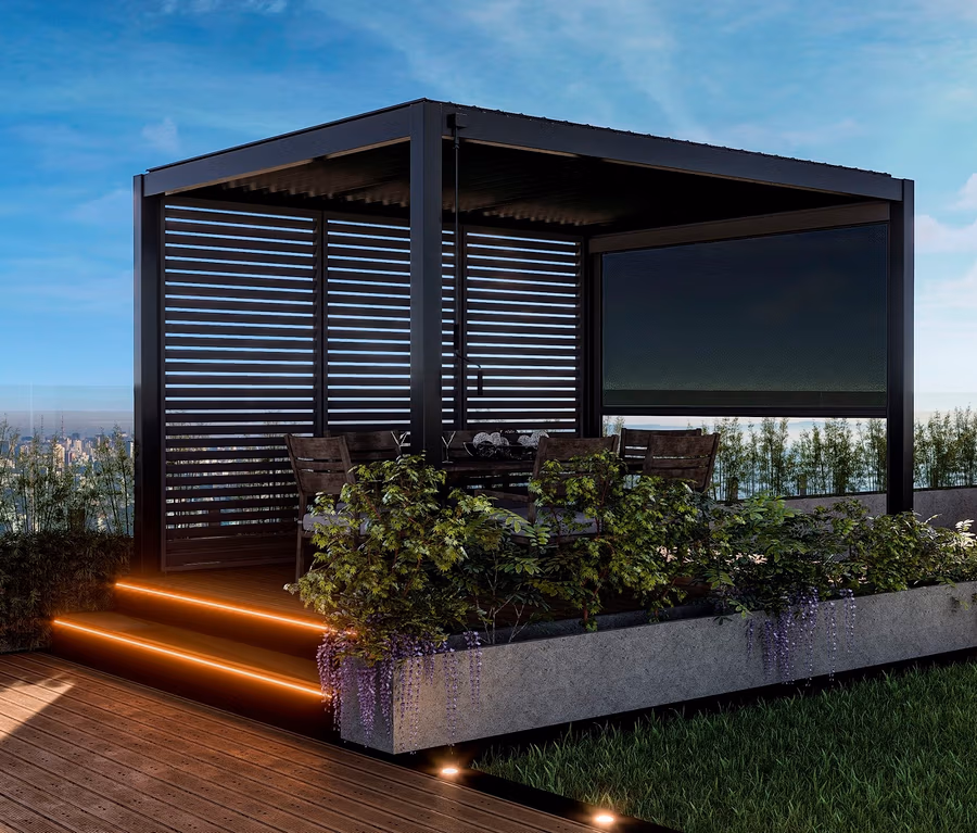 - Leco-Lamellenpergola »DELUXE« – stilvolle Aluminium-Pergola, mit 2 Seitenwänden: Lamellenwand und Rollo