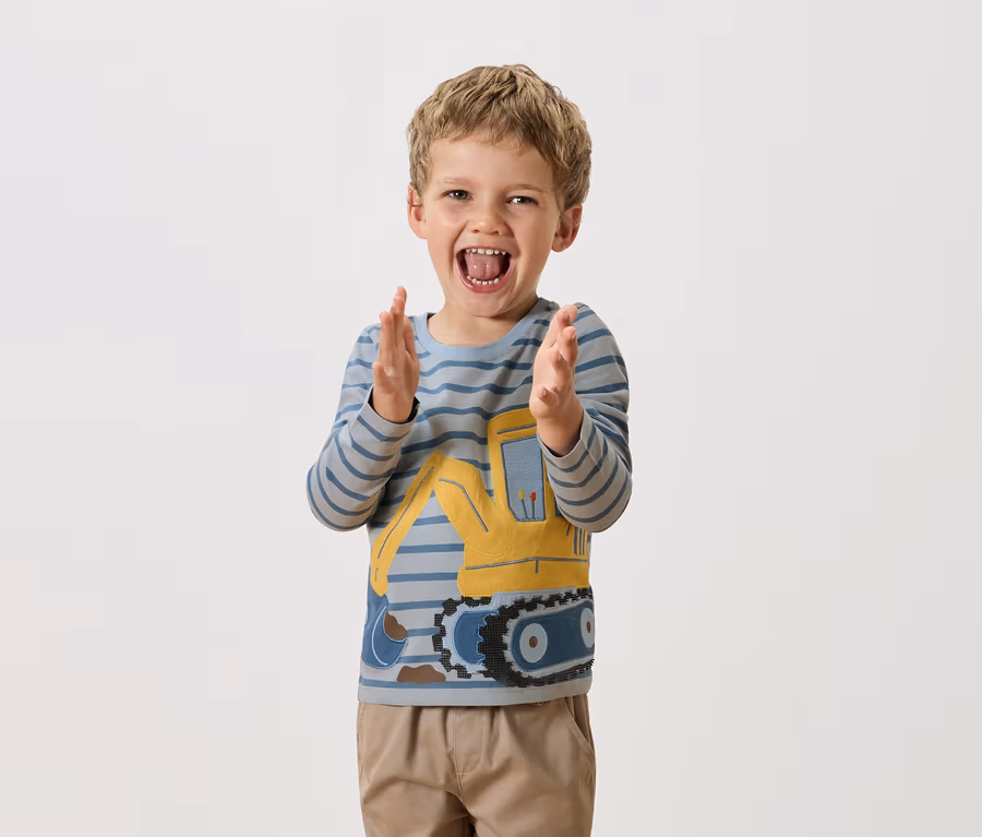- 1x hellblau mit mittelblauen Ringeln und mehrfarbiger Bagger-Applikation