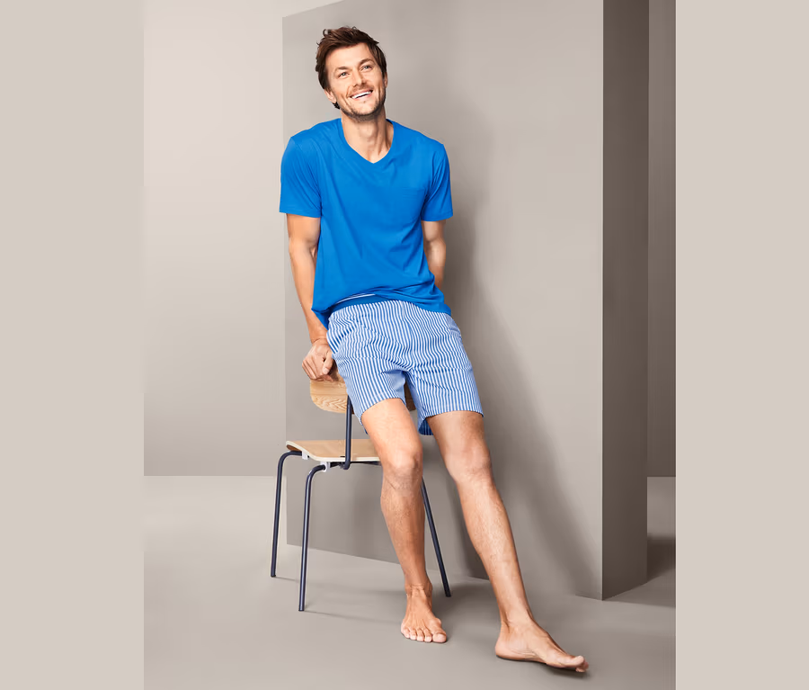 Wenn die Nächte im Sommer wärmer werden, werden die Pyjamas kürzer: Und mit diesem Shorty-Pyjama für Herren hat man die beste Basis für eine entspannte Nacht sowie für einen erholsamen Schlaf. Der Schlafanzug ist aus reiner, GOTS zertifizierter Baumwolle gefertigt und liegt dadurch angenehm weich auf der Haut. Die kurze Hose sitzt mit ihrem elastischen Bund einfach perfekt, das Oberteil im T-Shirt-Stil hat eine Brusttasche und ist mit V-Ausschnitt gearbeitet.