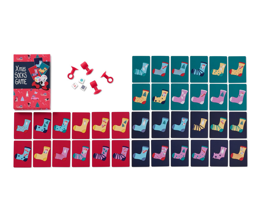 - Spiel-Idee: Alle 36 Karten liegen aufgedeckt nebeneinander, alle 3 Würfel werden gespielt, wer die Socke mit passendem Motiv, Farbe und Muster entdeckt und mit dem Saugnapf aufnimmt, gewinnt die Karte