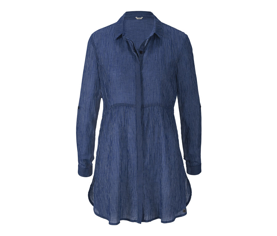 Die Bluse hat einen Kragen mit verdeckter Knopfleiste, krempelbare Ärmel, die mit einem Riegel fixiert werden können, und einen abgerundeten Saum mit Seitenschlitzen – für einen hohen Tragekomfort.