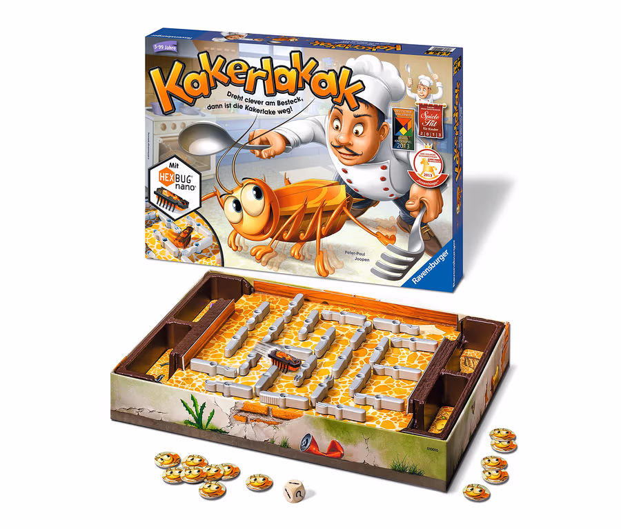 Kakerlaken sind eklig? Kommt drauf an. Manchmal sind sie auch sehr lustig. Vor allem in dem rasanten Spiel »Kakerlakak« aus dem Hause Ravensburger. Der kleine Held ist hier in jedem Fall der HEXBUG® nano® Miniaturroboter – und den gilt es, mit schnellen Reflexen und gutem Auge in die Falle zu lenken. Die kleine Kakerlake bewegt sich selbstständig im Labyrinth, dessen Wände aus Messern, Gabeln und Löffeln besteht. Per Würfel wird bestimmt, welches Besteckteil man gerade drehen darf, um den Lauf der Kakerlake zu ändern und sie in eine von vier Fallen zu leiten.