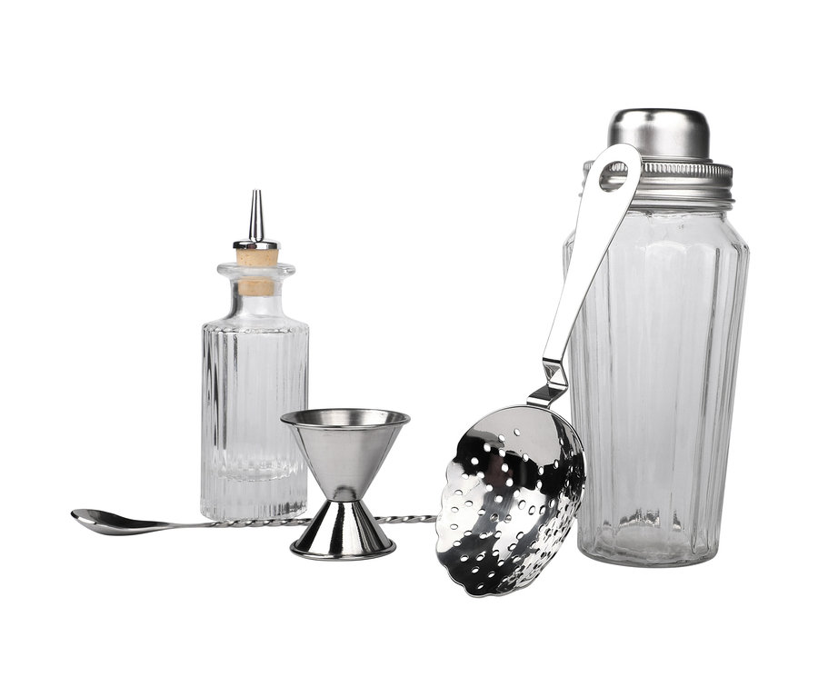 - Inkl. Glas-Shaker, Spritzflasche, Spritzflaschengießer, Edelstahl-Barlöffel, Edelstahl-Barsieb und Messbecher