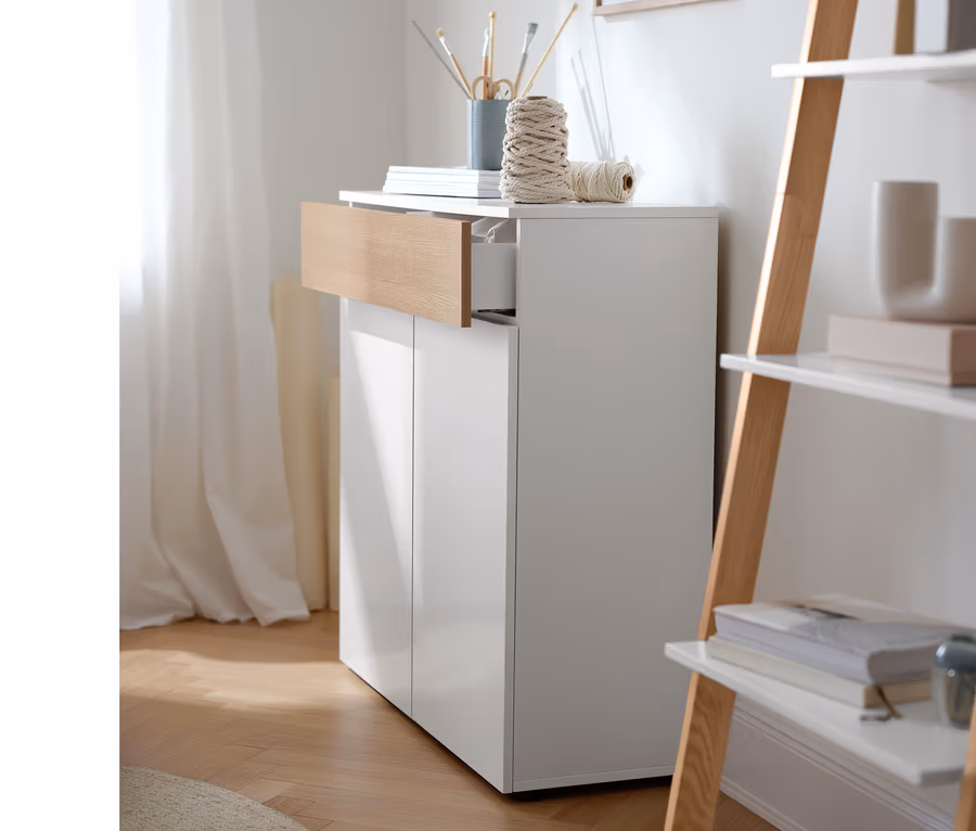 Möbeldesigner verzichten aus ästhetischen Gründen oft auf Griffe bei Türen und Schubladen. Ist das bei uns der Fall, kommt der Push-to-Open-Mechanismus zum Einsatz. Durch leichtes Drücken lassen sich die Möbel einfach öffnen und schließen. Die verwendeten Beschläge sind besonders hochwertig, damit Sie Schrank, Kommode und Co. auch mal schwungvoll schließen können.