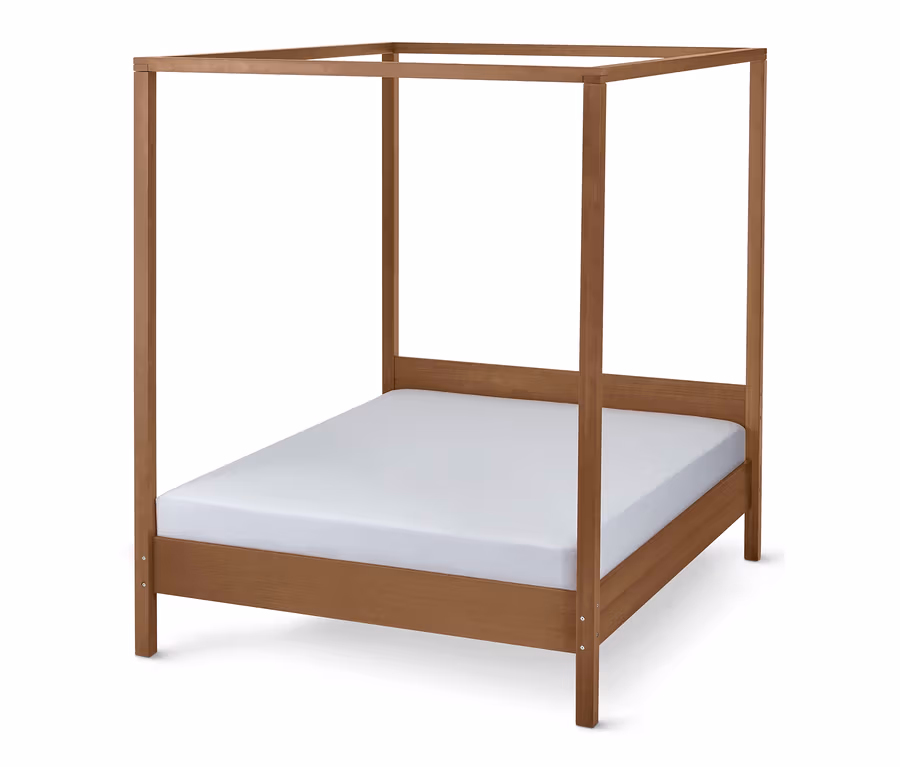 In diesem Himmelbett schläft es sich wie auf Wolken. Mit seiner ungefähr 160 mal 200 Zentimeter großen Liegefläche freut man sich jeden Tag besonders darauf, abends in die Federn zu hüpfen. Der Rahmen aus FSC®-zertifiziertem Eukalyptus-Massivholz lässt sich individuell dekorieren: Ob mit fließenden Stoffbahnen oder gemütlichen Lichterketten, das wird Bett zu einer kuscheligen Oase der Erholung. Um den Schlafzimmerfußboden nicht in Mitleidenschaft zu ziehen, sind Bodenschoner inklusive. Lattenrost und Matratze sind stattdessen nicht im Lieferumfang enthalten.