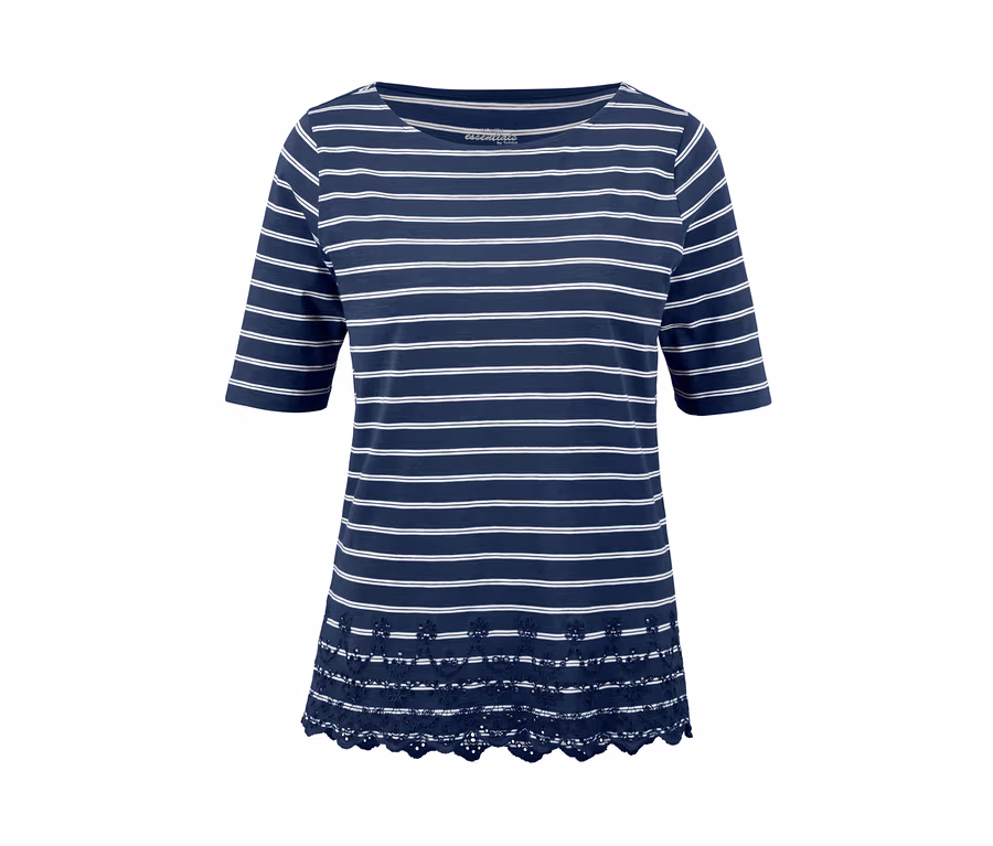 Dieses Shirt im maritimen Look ist das perfekte Oberteil für jedes sommerliche Outfit. Das Halbarmshirt ist aus reiner, hautsympathischer Baumwolle mit hochwertigem Strukturgarn gefertigt und hat einen leichten U-Boot-Ausschnitt. Seitenschlitze verleihen dem Damenshirt seinen hohen Tragekomfort und die feminine A-Form wird am unteren Saum von einer Lochstickerei dekorativ herausgestellt.