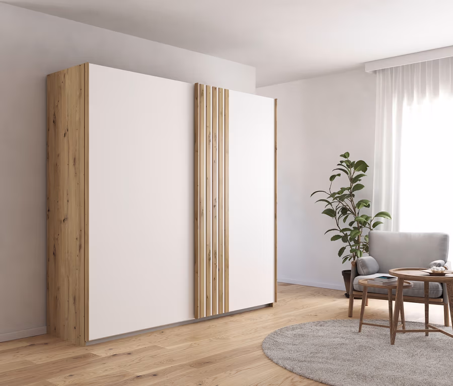 - Schwebetürenschrank in angesagter Lamellenoptik mit vertikalen Leisten