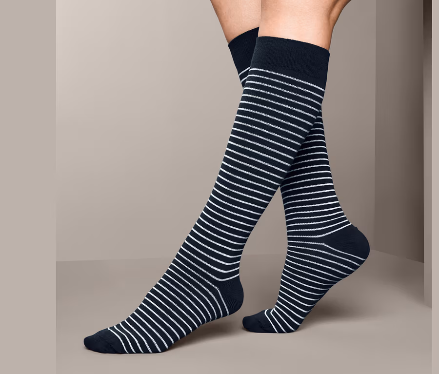 Die Damenstrümpfe liegen mit ihrem hohen Anteil an Bio-Baumwolle angenehm weich auf der Haut und der Komfortbund verhindert ein Einschnüren. Elasthan sorgt für Formbeständigkeit, einen perfekten Sitz und zusätzlichen Tragekomfort. Sie sind mit verstärkten Spitzen und Fersen sowie extraflacher Zehennaht gefertigt – und mit ihrer modischen Optik sieht man ihnen auch nicht an, dass es sich hier um Kompressionsstrümpfe handelt.