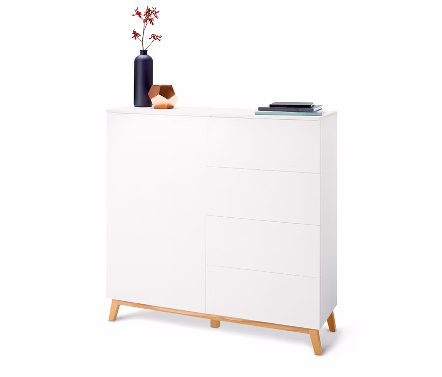 Auf der linken Seite hat das Möbel hinter einer Tür zwei individuell einsetzbare Einlegeböden, auf der rechten Seite gibt es vier klassische Kommoden-Schubladen. Die Tür lässt sich mit ihren Klickscharnieren im Handumdrehen montieren und ihre Softdämpfung erlaubt ein geräuschloses Schließen. Die geräumigen Schubladen haben wie die Tür eine komfortable Druckpunktöffnung, lassen sich komplett ausziehen und haben extrahohe Seiten – so kann ihr Stauraum in vollem Umfang genutzt werden.