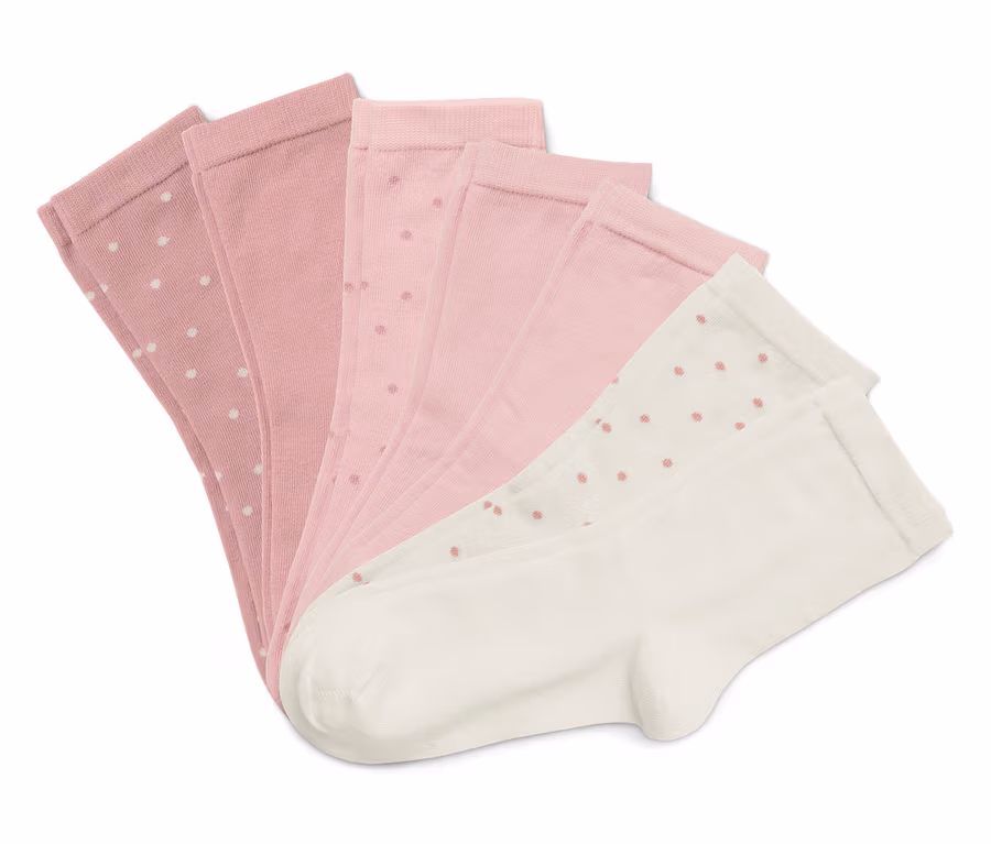 - 1x weiß mit altrosa Punkten, 2x pastellrosa, 1x altrosa mit weißen Punkten, 1x altrosa, 1x pastellrosa mit altrosa Punkten, 1x weiß