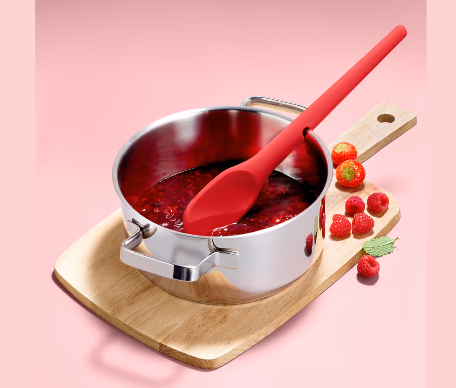 Rühren, rühren, rühren … Gerade beim Einmachen sollte der Löffel immer im Einsatz sein. Weil dieser zwischendurch auch gern mal auf der Arbeitsfläche abgelegt wird, landet leider viel zu oft viel zu viel der süßen Marmelade neben dem Topf. Diese Zeiten sind nun endlich vorbei: Dank des Funktions-Kochlöffels, der mithilfe seiner integrierten Aussparung ganz einfach am Topf- oder Schüsselrand eingehängt werden kann. Beim Umrühren sorgt der robuste Edelstahlkern für mehr Stabilität. Gleichzeitig ist der Kochlöffel durch seine Silikonummantelung besonders schonend zu Pfannen- und Topf-Oberflächen. Und wenn alles eingemacht ist, darf der Löffel direkt in die Spülmaschine wandern.